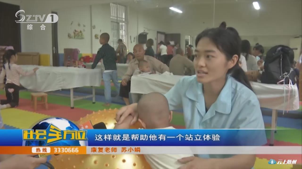 (采访:康复老师 苏小娟)给这个孩子做一下扶站训练,他的脚踩在地上,帮助他站立,他的双手扶在大龙球上,给他一个扶持,这个孩子有点触觉过敏,手不扶脚不着地,这样就是帮助他有一个站立体验。