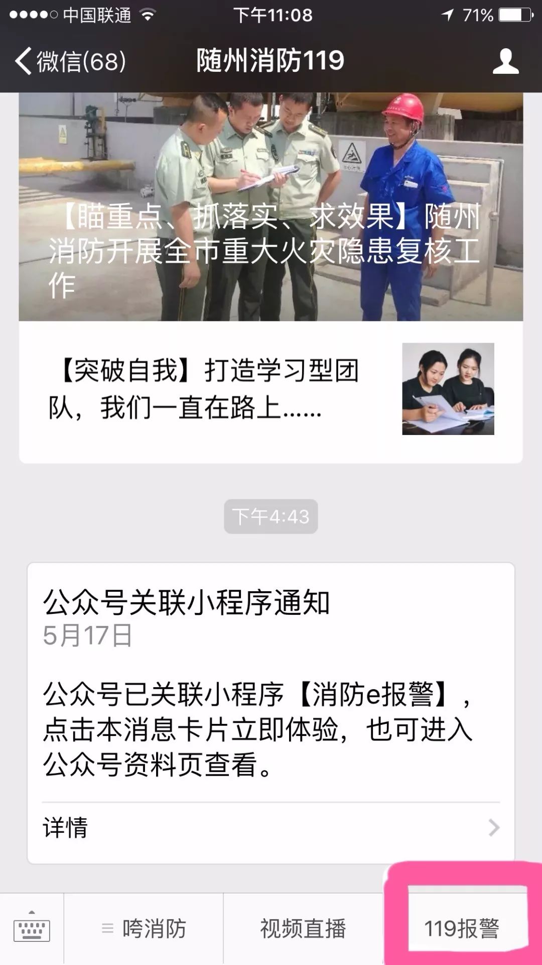 1 打开微信,搜素“随州消防119”微信公众号并点击进入公众号;