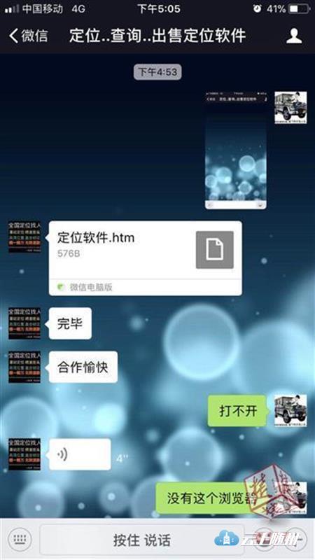 去年12月17日,25岁的赵先生在武胜路逛街,忽然看到手机微信群里有人发了一条广告信息,写着“精准定位、寻找老赖、出售定位软件”等内容。赵先生想到跟自己有生意往来的李某欠钱没还,现在联系不上李某,何不试试?赵先生马上添加发广告的人为好友,和对方攀谈起来。