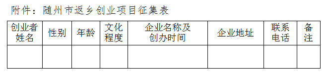 为全面贯彻落实《省委办公厅、省政府办公厅关于印发,〈湖北省“三乡”工程三年行动计划〉、〈湖北省推进实施“三乡”工程的支持措施〉的通知》(鄂办法【2018】13号)文件精神,更好地为我市返乡创业者提供政策支持,帮助解决创业中的实际困难,市人社部门拟在全市范围内征集返乡创业项目。凡在我市乡镇(乡村)创办农业合作社类、家庭农场类、农林产品加工类、休闲农业类、乡村旅游、特色种养殖、农村服务业类、创新特色企业类等产业项目,均可自愿填报。返乡创业项目征集表发至市创业办信箱,时间截至2018年6月30日。