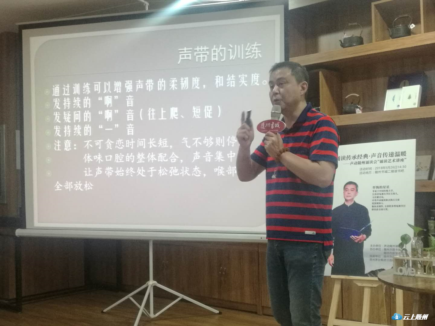 5月26日下午,声动随州诵读会主办,随州市图书馆、随州市新华书店联合举办的诵读艺术讲座在随州书城二楼成功举行。来自声动随州诵读会的近40名诵友和闻讯而至的诵读爱好者近百人,近距离聆听了声音大咖的精心授课和耐心指导。