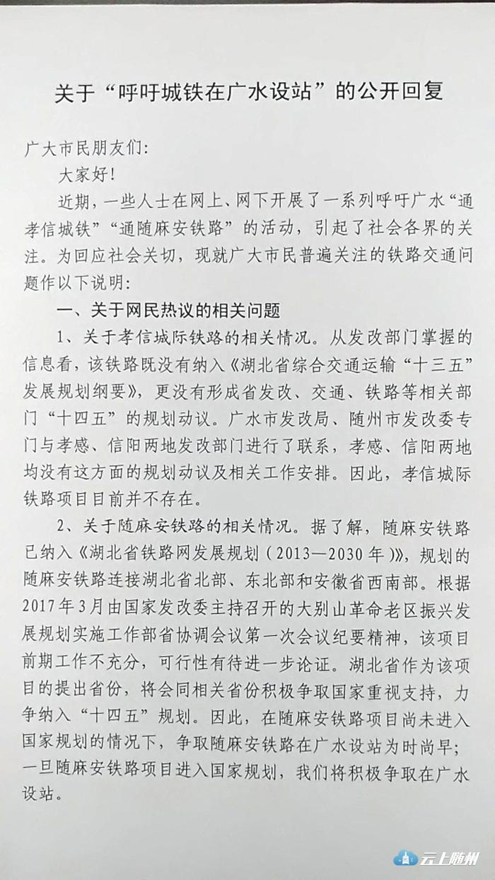 近期,一些人士在网上、网下开展了一系列呼吁广水“通孝信城铁”“通随麻安铁路”的活动,引起了社会各界的关注。为回应社会关切,现就广大市民普遍关注的铁路交通问题作以下说明: