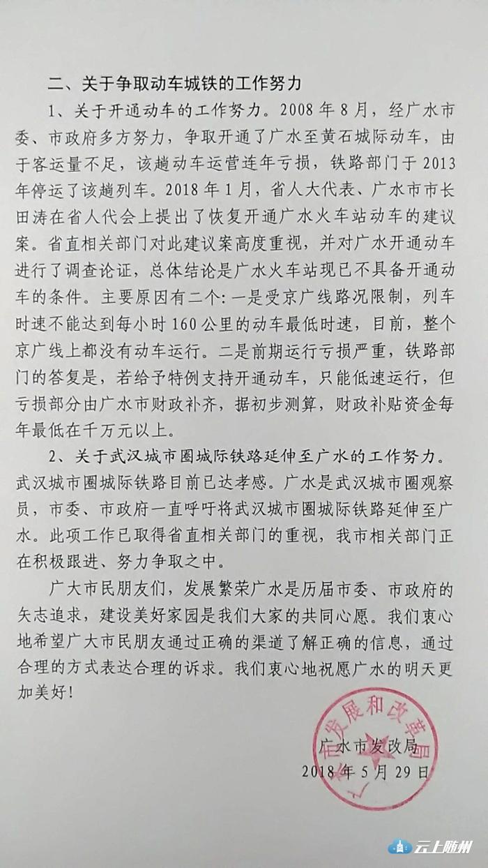 1、关于开通动车的工作努力。2008年8月,经广水市委、市政府多方努力,争取开通了广水至黄石城际动车,由于客运量不足,该趟动车运营连年亏损,铁路部门于2013年停运了该趟列车。2018年1月,省人大代表、广水市市长田涛在省人代会上提出了恢复开通广水火车站动车的建议案。省直相关部门对此建议案高度重视,并对广水开通动车进行了调查论证,总体结论是广水火车站现已不具备开通动车的条件。主要原因有二个:一是受京广线路况限制,列车时速不能达到每小时160公里的动车最低时速,目前,整个京广线上都没有动车运行。二是前期运行亏损严重,铁路部门的答复是,若给予特例支持开通动车,只能低速运行,但亏损部分由广水市财政补齐,据初步测算,财政补贴资金每年最低在千万元以上。