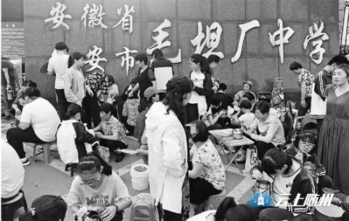 毛坦厂中学的大门口,家长给孩子们送饭。