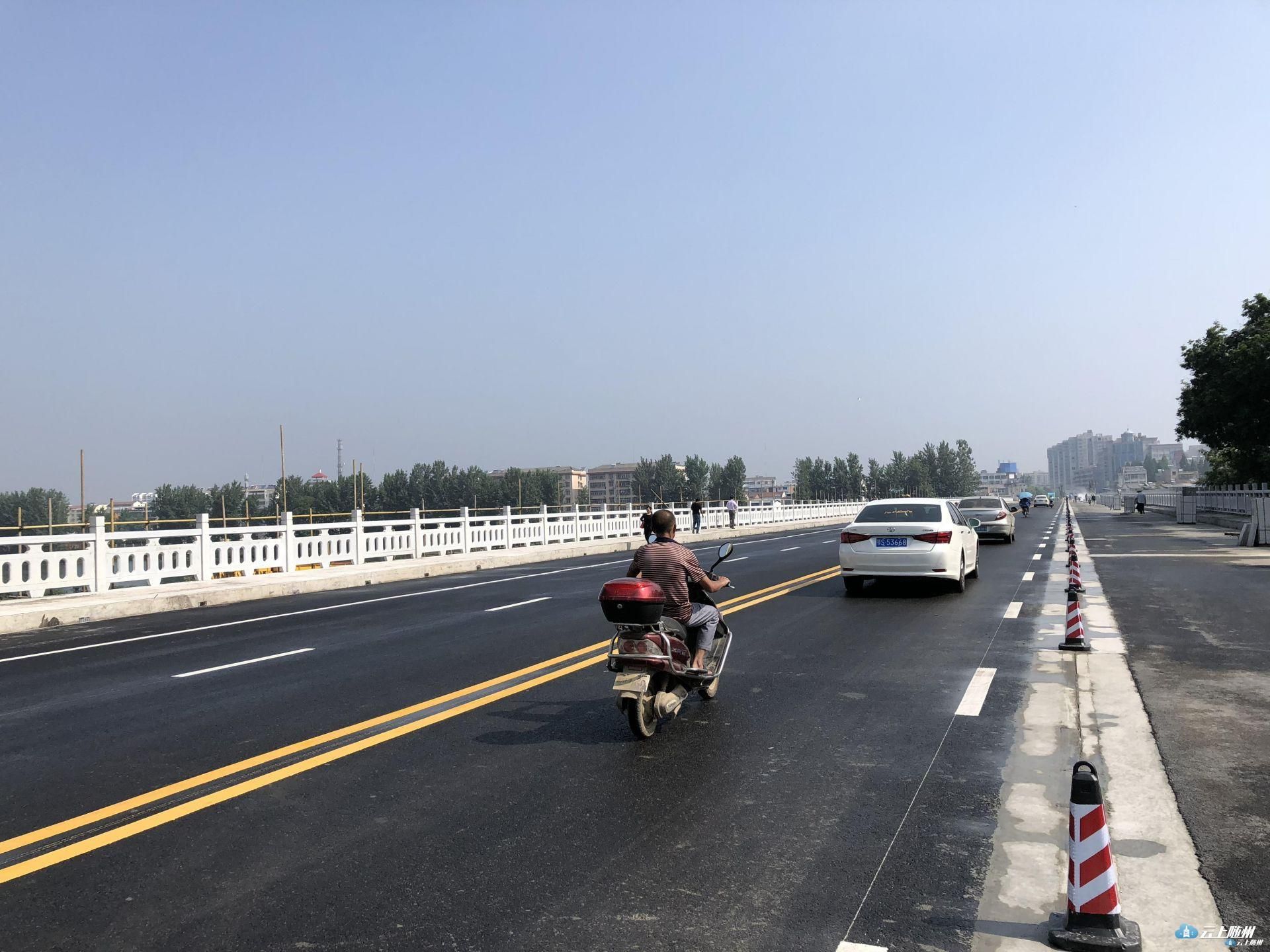 今天上午九点,涢水一桥开始试通车。目前老桥桥面的护栏正在抓紧安装,预计六月底正式通车。试通车期间,车辆请减速慢行,禁止大中型车辆(含客车、货车)通行。请广大市民严格自觉遵守规定,违反相关规定者将依法处理。