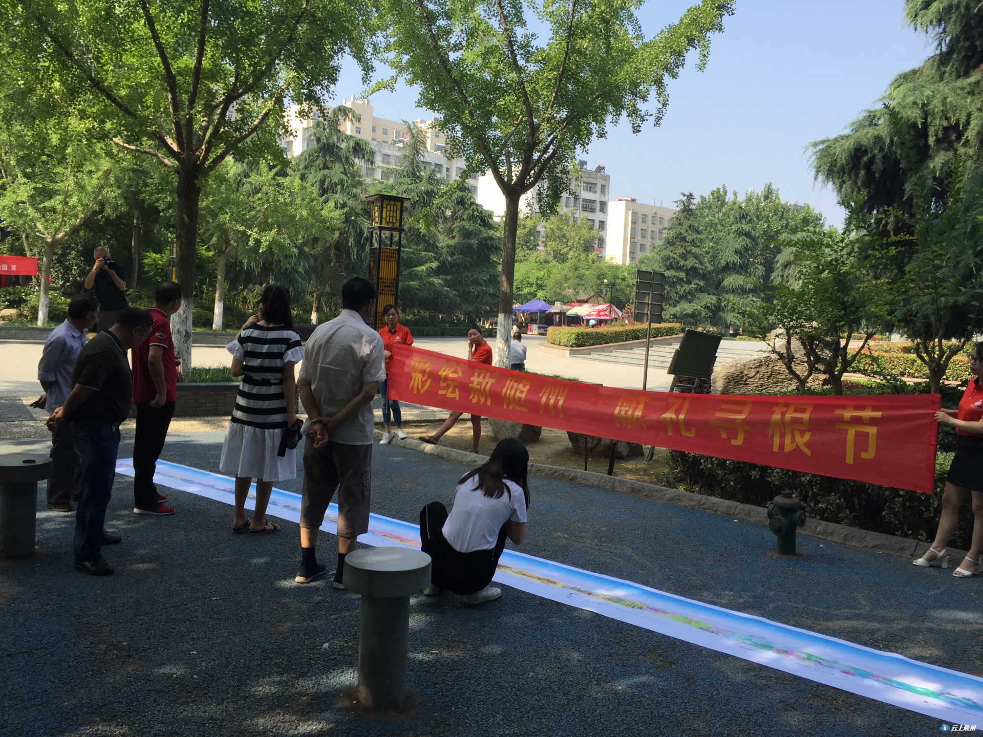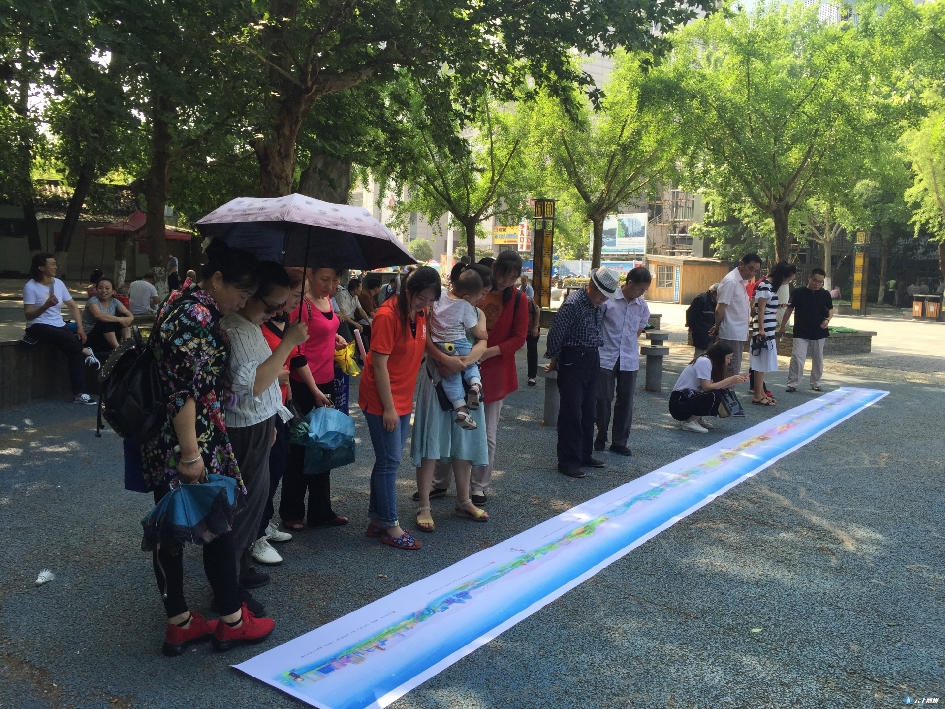 值2018年世界华人炎帝故里寻根节来临之际,随州市一点文化传媒公司的设计师历时两个多月,用电脑鼠绘技术,将炎帝故里、市博物馆、大洪山、银杏谷、文化公园、灵秀广水等12个随州景点画进了一幅名为“印象随州”的水彩画,并制成10米长卷,献礼寻根节。图为市民在神农公园现场欣赏画卷。