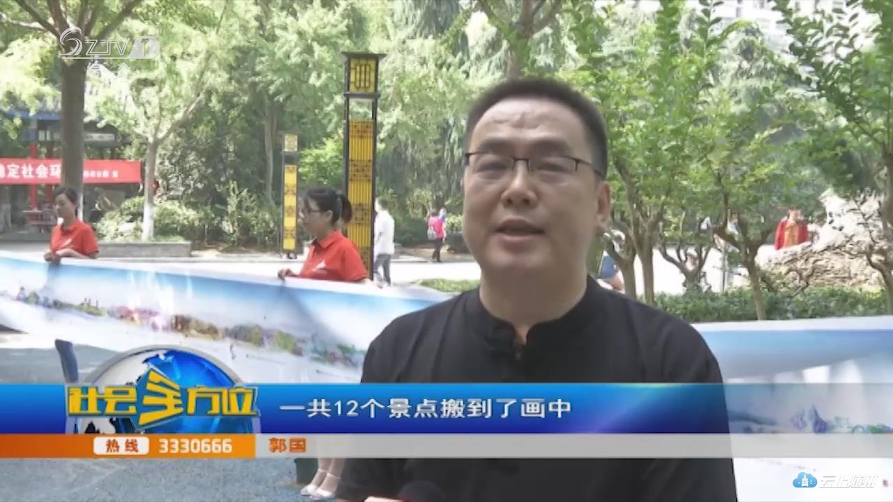 记者看到,这幅画卷全长十米,将我市12个景点全部纳入。碧蓝天空下,连绵山峰前,炎帝故里、大洪山、银杏谷、女儿国等景区以一个整体的形式完美呈现,引得不少人驻足观看。