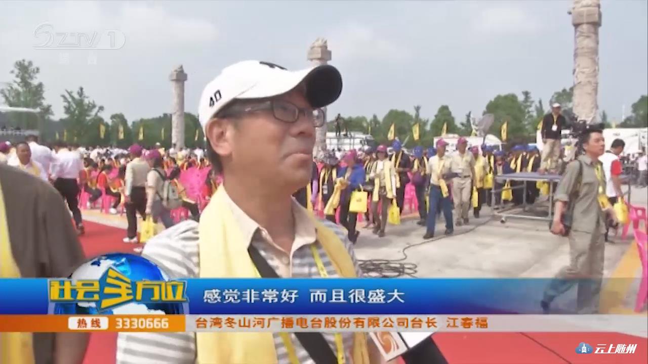(采访:冬山河广播电台股份有限公司台长江春福)我们是广播的代表,在宜兰有冬山河广播电台,东方广播电台,中原广播电台,还有花莲的莲友广播电台,我们今天很高兴,参加我们的炎帝诞辰庆典。感觉非常好,而且很盛大,我们炎黄子孙能有这种荣幸,有这种荣耀,我们都很高兴。