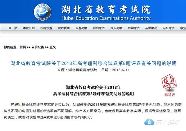 昨日,湖北省教育考试院在官网上发布了一则《湖北省教育考试院关于2018年高考理科综合试卷第8题评卷有关问题的说明》(以下简称《说明》)。《说明》中提到,经理科综合试卷评卷专家组评议认为,湖北省使用的2018年高考理科综合试卷第8题本身无问题,但不同的群体从不同的角度对试题的B选项有不同理解。综合各方面意见,也考虑到高中教学实际,根据专家组意见,经研究决定,湖北省对该题单选A或单选B选项的作答均给6分。