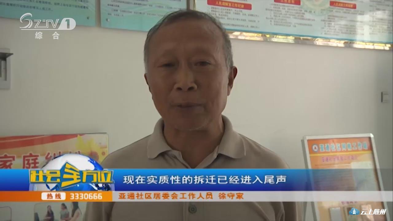 【采访】亚通社区居委会工作人员 徐守家:我们居委会比较大,分了几个区域,东南西北区。各个区域都有组长,配合建投公司日日夜夜的,进住户拆迁做工作,现在实质性的拆迁已经进入尾声,居民反映非常好,尤其现在经过拆迁后的居民到公租房,到暂缓房去了之后,都高兴得合不拢嘴。