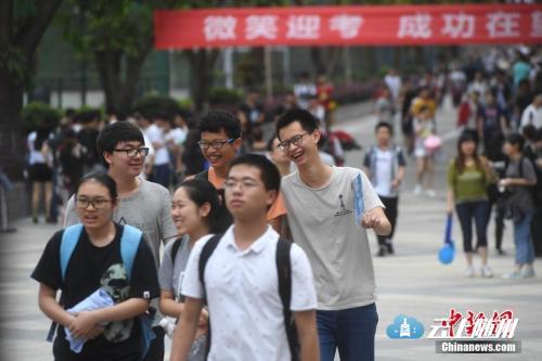 资料图:6月8日,重庆育才中学考点外,考生面带笑容走出考场。中新社记者 陈超 摄