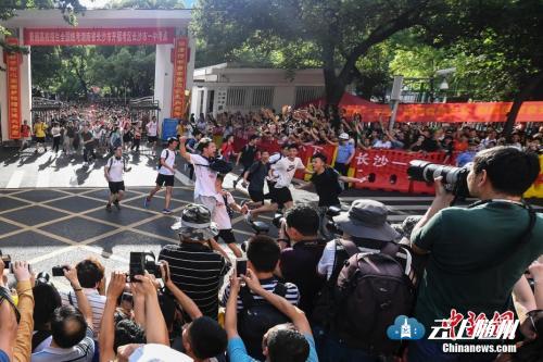资料图:6月8日下午,湖南长沙市一中考点外,考生跑出考场,庆祝高考结束。 中新社记者 杨华峰 摄