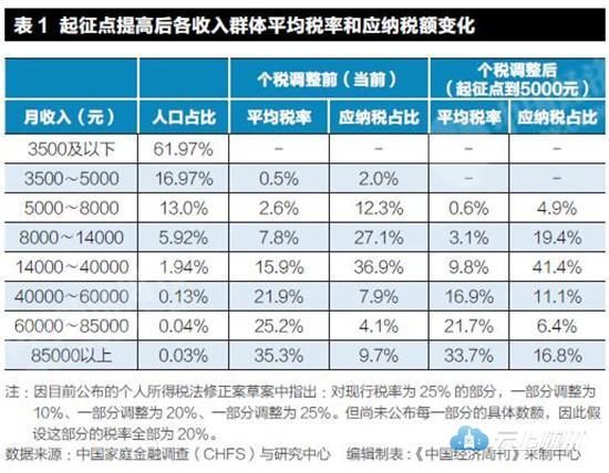 月收入在8000~14000元的这部分群体,在起征点提升至5000元时,对应的平均税率由现在的7.8%下降为3.1%,对应的收入增长率为5.1%;月收入在14000~40000元的这部分群体,在起征点提升至5000元时,对应的平均税率由现在的15.9%下降为9.8%,对应的收入增长率为7.3%。
