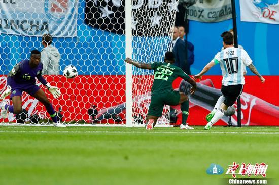2018俄罗斯世界杯D组阿根廷2:1战胜尼日利亚。图为梅西射门。 中新社记者 富田 摄