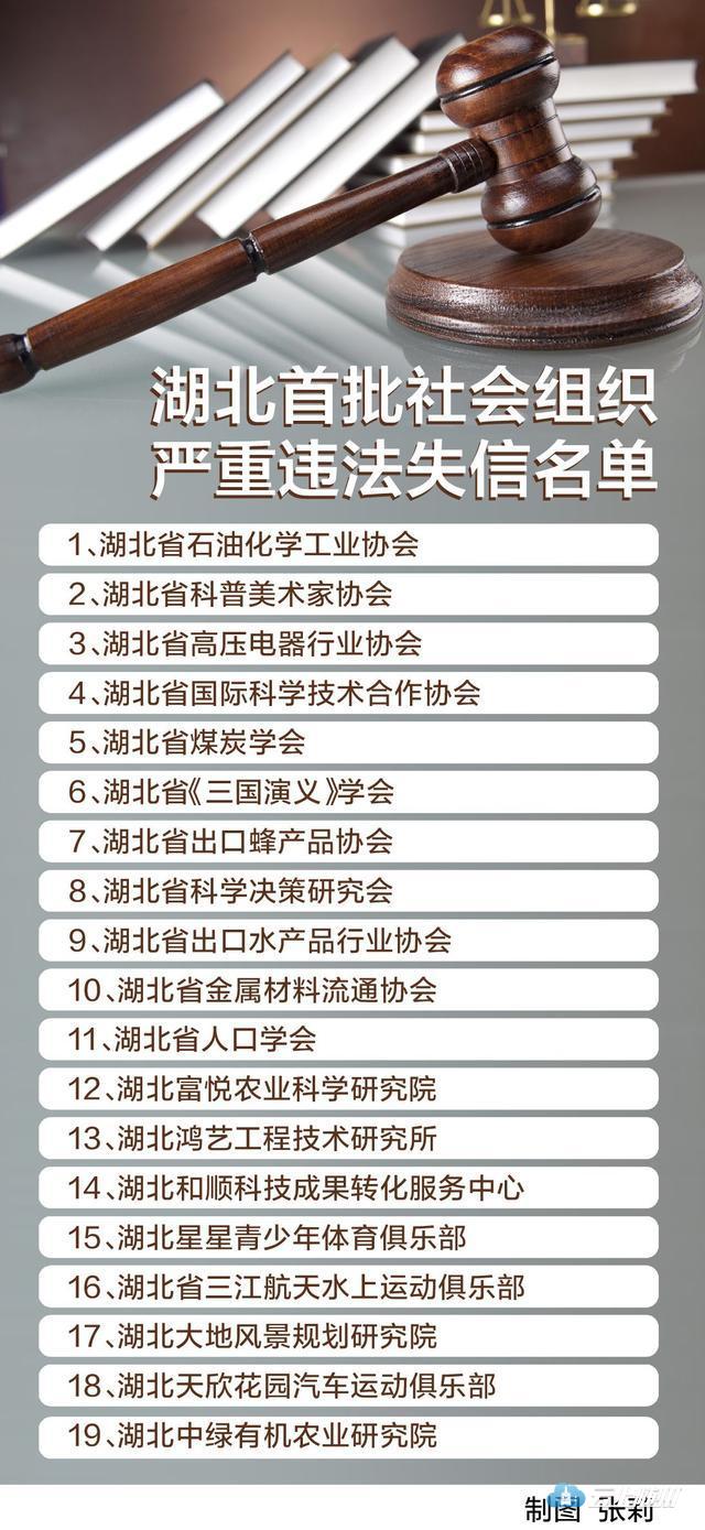 湖北省民政厅社会组织管理处有关负责人介绍,经调查,湖北省石油化学工业协会等18家社会组织存在受到登记管理机关撤销登记行政处罚的情形,社会组织湖北中绿有机农业研究院存在受到限期停止活动行政处罚的情形,依据《社会组织信用信息管理办法》有关规定,这19家社会组织被列入社会组织严重违法失信名单。