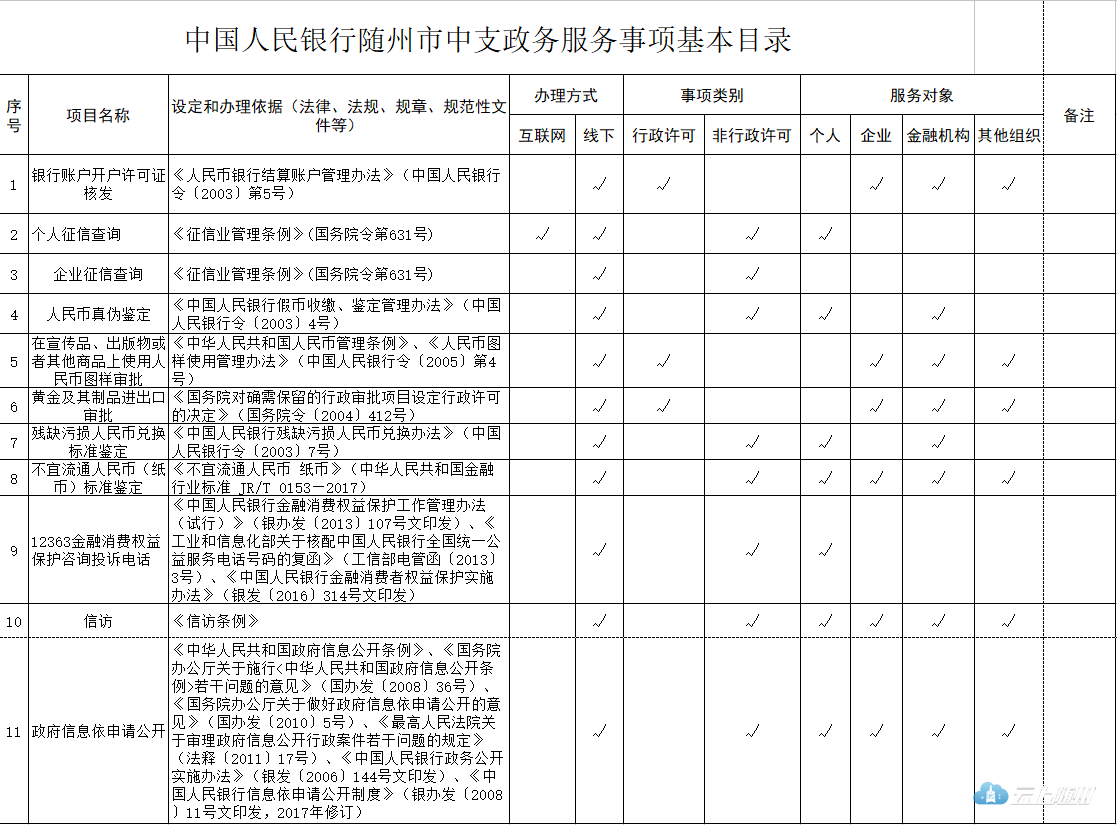 为持续推进“放管服”,根据《中国人民银行政务服务事项基本目录》以及工作职能,人民银行随州市中心支行编制了《中国人民银行随州市中心支行政务服务事项目录》,现面向社会予以公布。