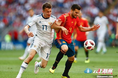 比赛一开场,以传控体系见长的西班牙队逐渐掌握场上主动,控球率一度高达72%。东道主俄罗斯队积极防守,借机寻找反击机会。比赛进行到第10分钟,西班牙队中场伊斯科送出长传,纳乔前插停球后被俄罗斯后卫日尔科夫踢倒,西班牙队前场获得位置不错的定位球。