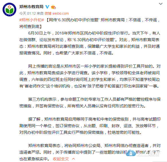 6月30日上午,2018年郑州市区民办初中阶段性评价举行。当天下午,有人在微信群、论坛发布言论,称:“6.30民办初中评价泄题”。对此,郑州市教育局表态:郑州市教育局将对此事彻查到底,保障最广大学生和家长的利益,并及时通报调查情况。同时,也希望广大家长不信谣,不传谣。