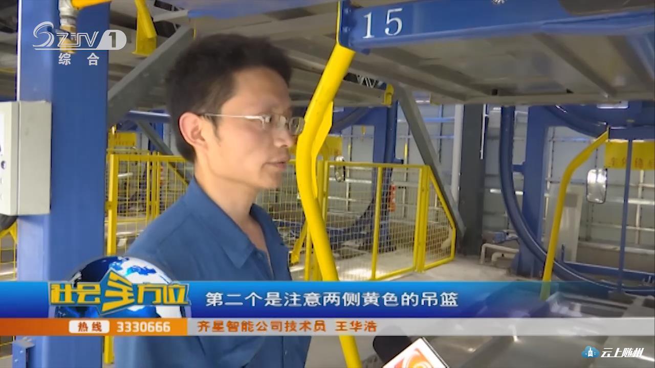 【采访 齐星智能公司技术员 王华浩】 第一个要注意车辆是直进 。注意他的后视镜。第二个是注意黄色的两侧的吊篮。第三个是阻挡器。要过阻挡器。车子要在阻挡器与前挡位之间
