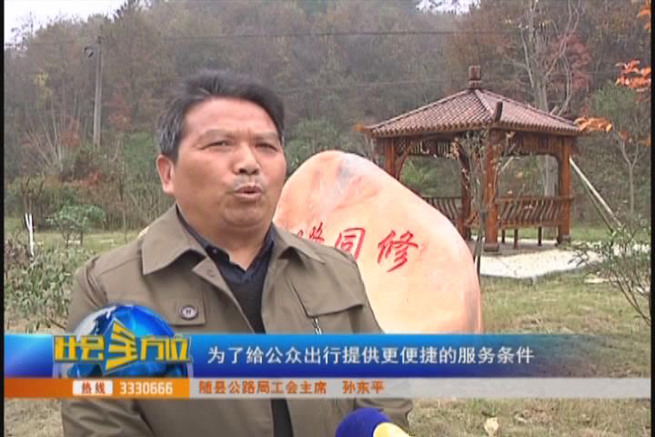 【采访】随县公路局党委委员 工会主席 孙东平:为了给公众出行提供更便捷的服务条件,打造随县公路品牌,我们今年在随南片主要国省干线公路打造了文明驿站一个,修建完善了观景台,休息区加水点三处,并在公路沿线布置了景观石十处展示了公路文化,得到了过往司机的一致好评。