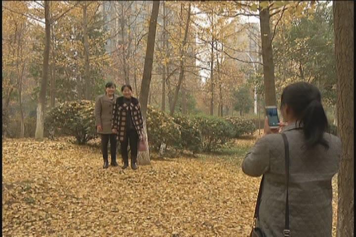 【采访】市民:这里有一片银杏叶,感觉心情很好,能放松心情。 树叶看着金黄黄的,又在市中心,带孩子或者是自己过来,意境都还可以,又离家近,来回又方便。