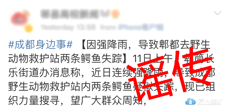 传闻:7月11日上午,网传因连续强降雨,导致成都野生动物救护站内两条鳄鱼疑似失踪。