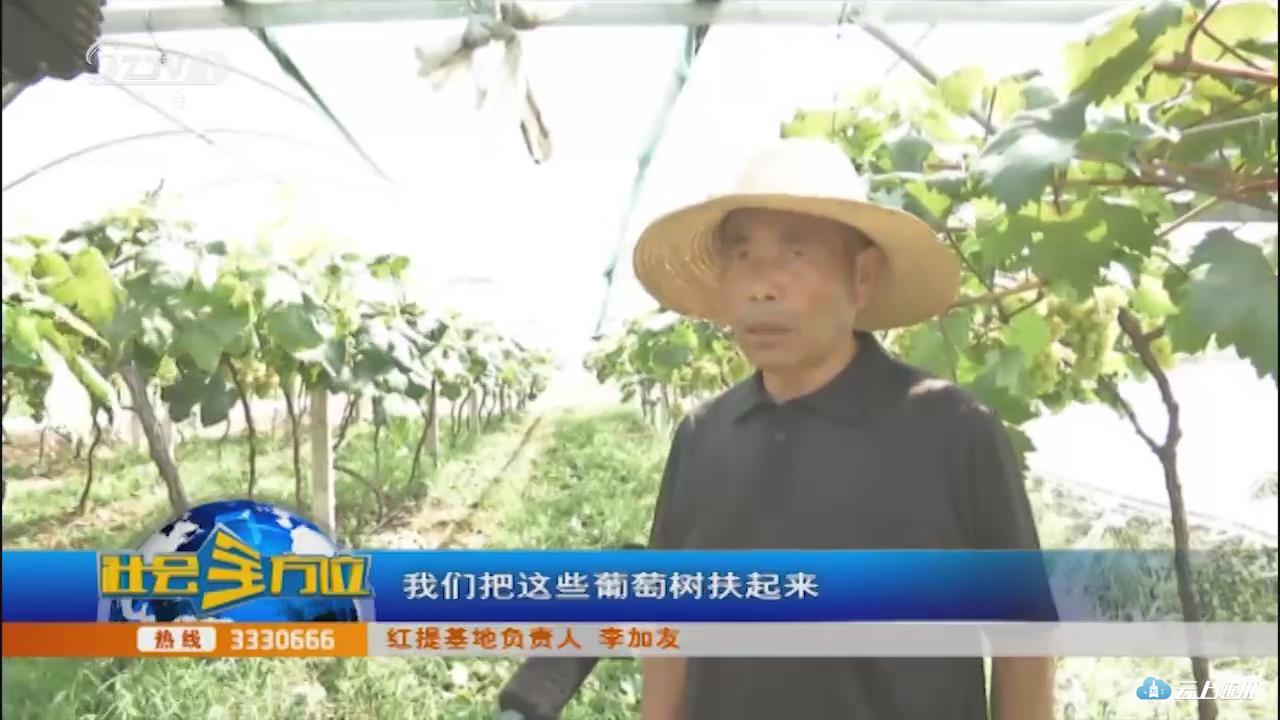 【采访】红提基地负责人 李加友:我们用人扶起来,先用一个棚做实验,我们把这些葡萄树扶起来,一看这些树还可以。有人说以后没有收,我们还是派人在田里整枝,我们想这下肥来不及,我们就把面上施了一层农家肥,施了肥以后我们每个环节,不惜一切代价,要劳力,就大量的用劳力,把每个环节都没有马虎,所以才有现在这个样子。