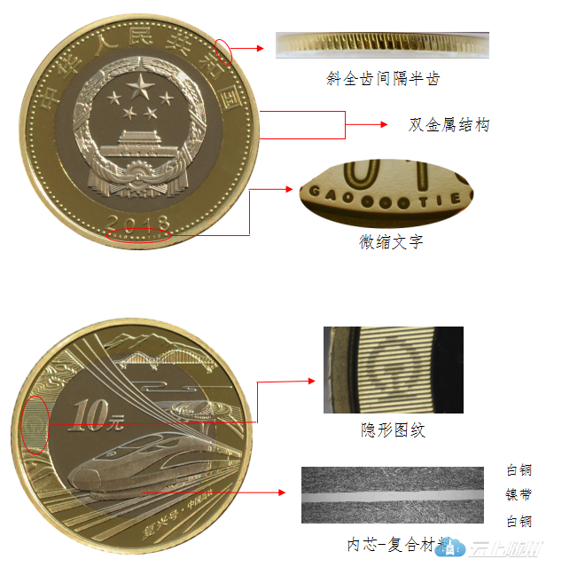 硬币外环为黄色铜合金,内芯为具有独特机读性能的镍带复合白铜材料。