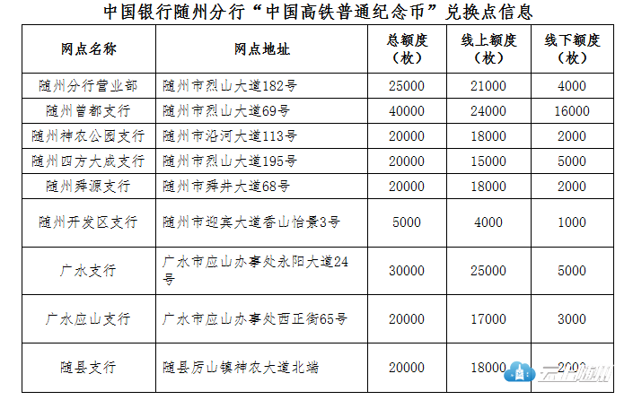 中国人民银行将于2018年9月3日起发行“中国高铁普通纪念币”一枚,面额为10元,全国发行量2亿枚,随州市分配数量为20万枚。中国高铁普通纪念币与现行流通人民币职能相同,与同面额人民币等值流通。本次全部采取预约方式发行,我市预约兑换工作将由中国银行随州分行及其分支机构承担。现将有关事项公告如下: