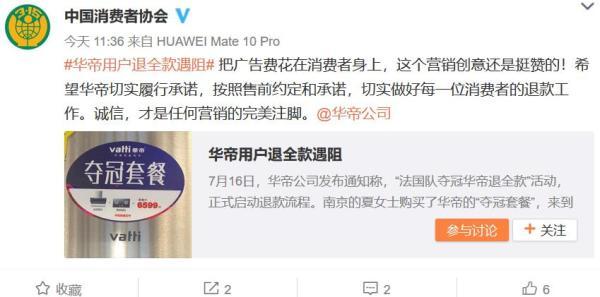 中消协微博喊话华帝:“法夺冠退全款”创意挺赞,望履行承诺
