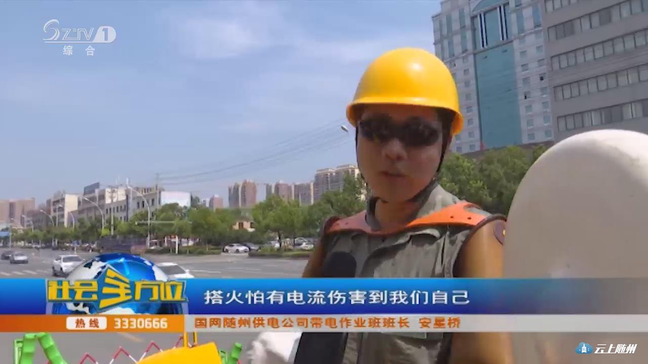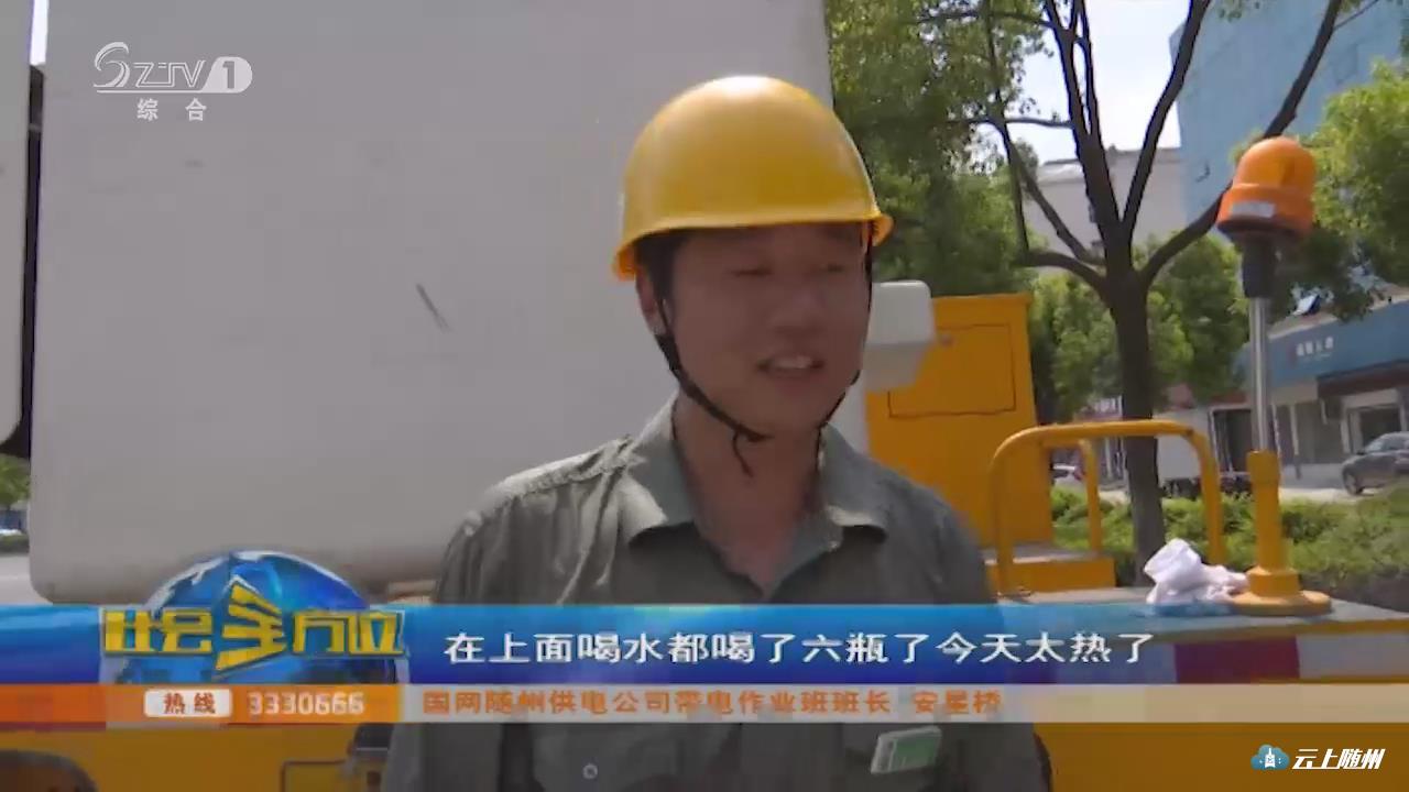【采访】国网随州供电公司带电作业班班长 安星桥:现在天气炎热,好多用户的负荷增加,变压器到处都要增容,夏天到了,我们工作还是比较繁重一点的,从早上五六点钟开始一直工作到上午,一天有好几个地方的工作要搞,现在高温高负荷又不好停电,所以带电作业对客户比较好一点,减少停电。