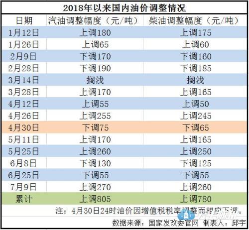 上一轮调价(7月9日)时,油价创下年内最大涨幅,汽油价格每吨上调270元,柴油价格每吨上调260元。随后,受多种因素影响,国际油价高位回落。
