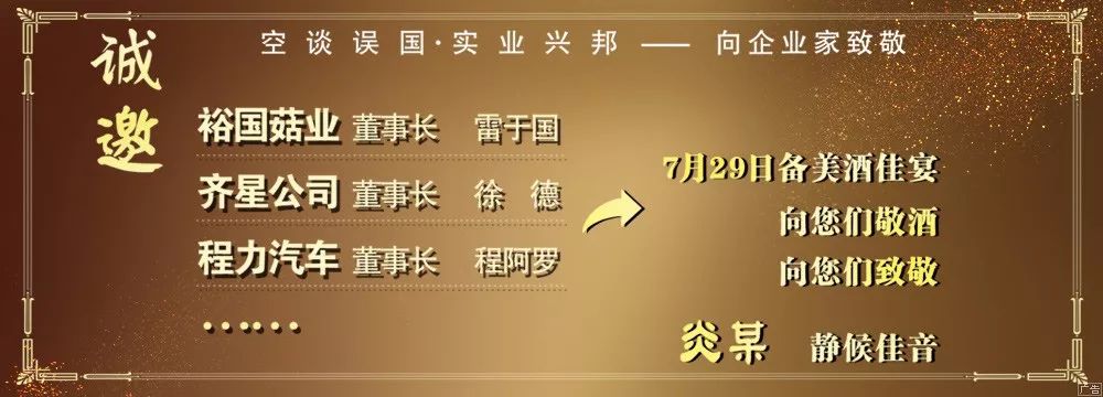 裕国菇业董事长雷于国、齐星公司董事长徐德、程力集团董事长程阿罗等随州知名企业家,7月29日备美酒佳宴,向你们敬酒,向你们致敬!