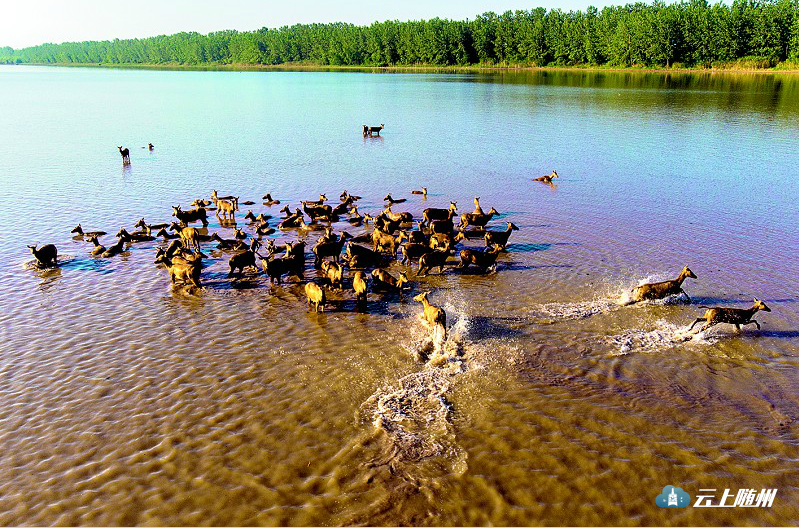 7月19日,荆州市石首麋鹿自然保护区内,今年新生的151头麋鹿在江水中嬉戏。天鹅洲湿地是长江中下游保存最完好的一块湿地,为国家级自然保护区。保护区的麋鹿已由最初的94头发展到如今的1200余头,并形成三合垸、杨波坦、洞庭湖3个野生种群。今年新生麋鹿数量为历年之最。