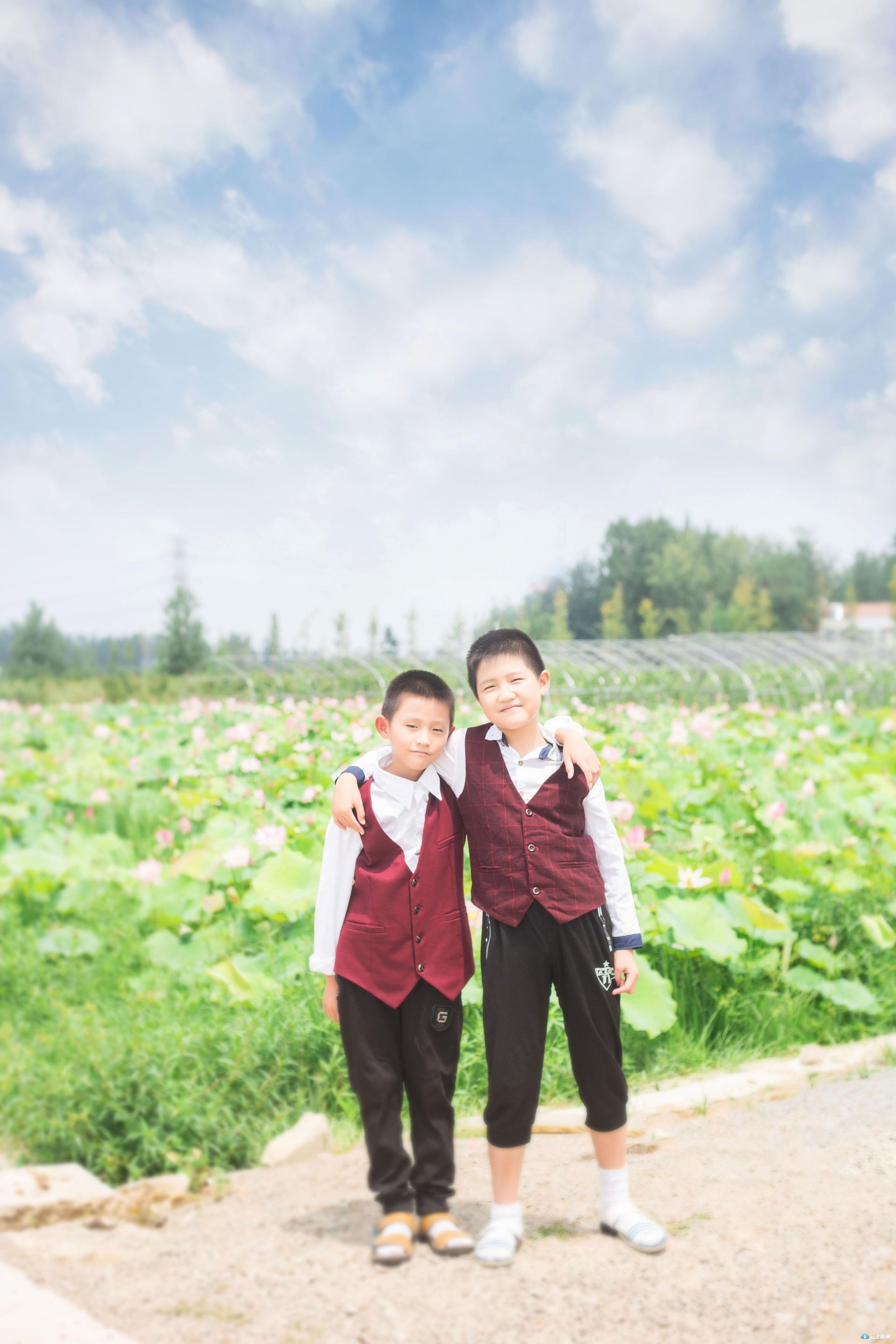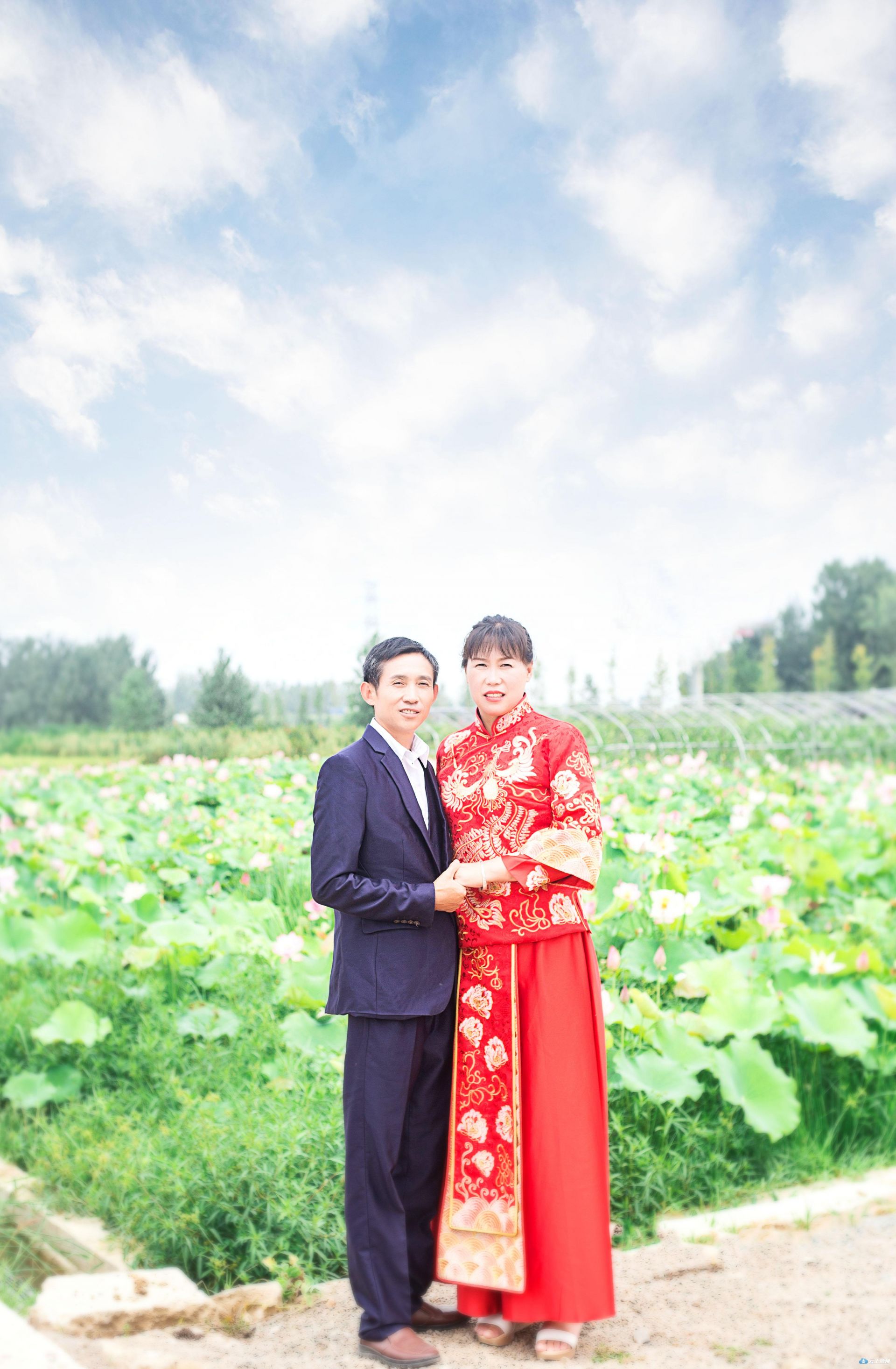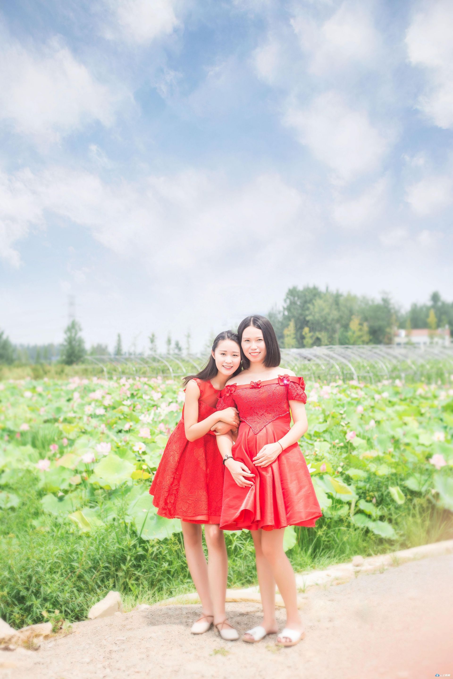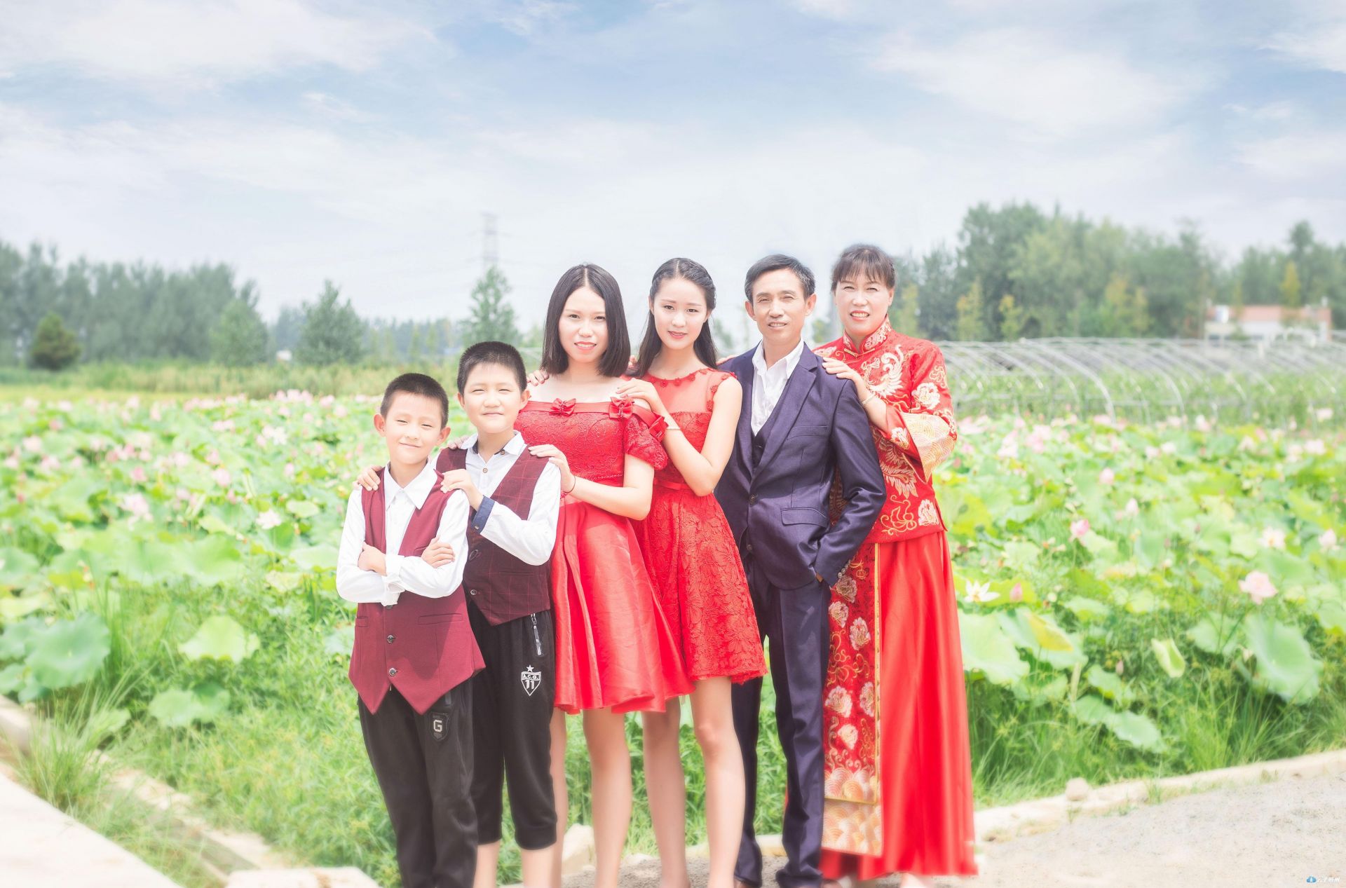 随后,一家六口换上了影楼带来的红色礼服和西装,来到村子里的一处荷塘拍摄第二组照片。虽然天气炎热,但满塘的荷花美景和团圆的喜悦让他们开心不已。