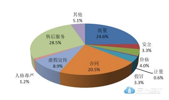 根据投诉性质分析,售后服务问题占28.5%,质量问题占24.6%,合同问题占20.5%,虚假宣传问题占8.9%,价格问题占4.0%,假冒问题占3.3%,安全问题占3.3%,人格尊严占1.2%,计量问题占0.6%,其他问题占5.1%。售后服务、产品质量和合同问题仍然是引发投诉的主要原因,占投诉总量的七成以上。与2017年同期相比,合同、虚假宣传、价格、假冒、安全、人格尊严方面的投诉比重有所上升。
