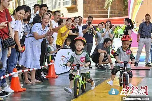 某儿童滑步车大赛上宝宝们在家长的鼓励下勇敢前行。 中新社记者 骆云飞 摄。