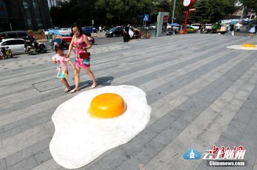 7月30日,数个巨型“煎蛋”模型“摊”在西安一商场门前,吸引过往行人注目。连日来,西安持续高温天气,最高气温超过40℃。中新社记者 张远 摄