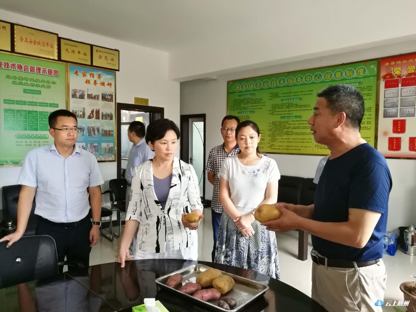 在唐县镇农技站,毕道丽询问了农技工作情况,对农技站的工作给予了充分肯定。多年以来,唐县镇农技站持续推广马铃薯深沟高垄覆膜种植技术,选优马铃薯品种,组建农民专业合作社,引领小土豆闯大市场,目前,农技站正计划引进推广经济效益更好的新品种。