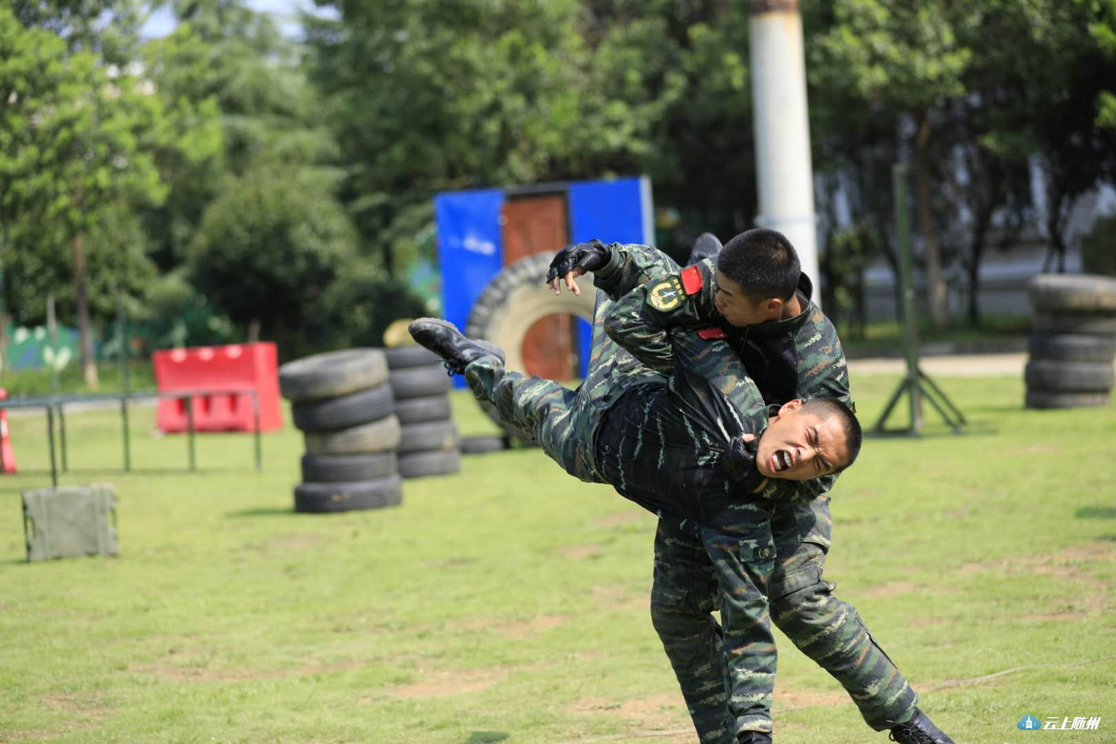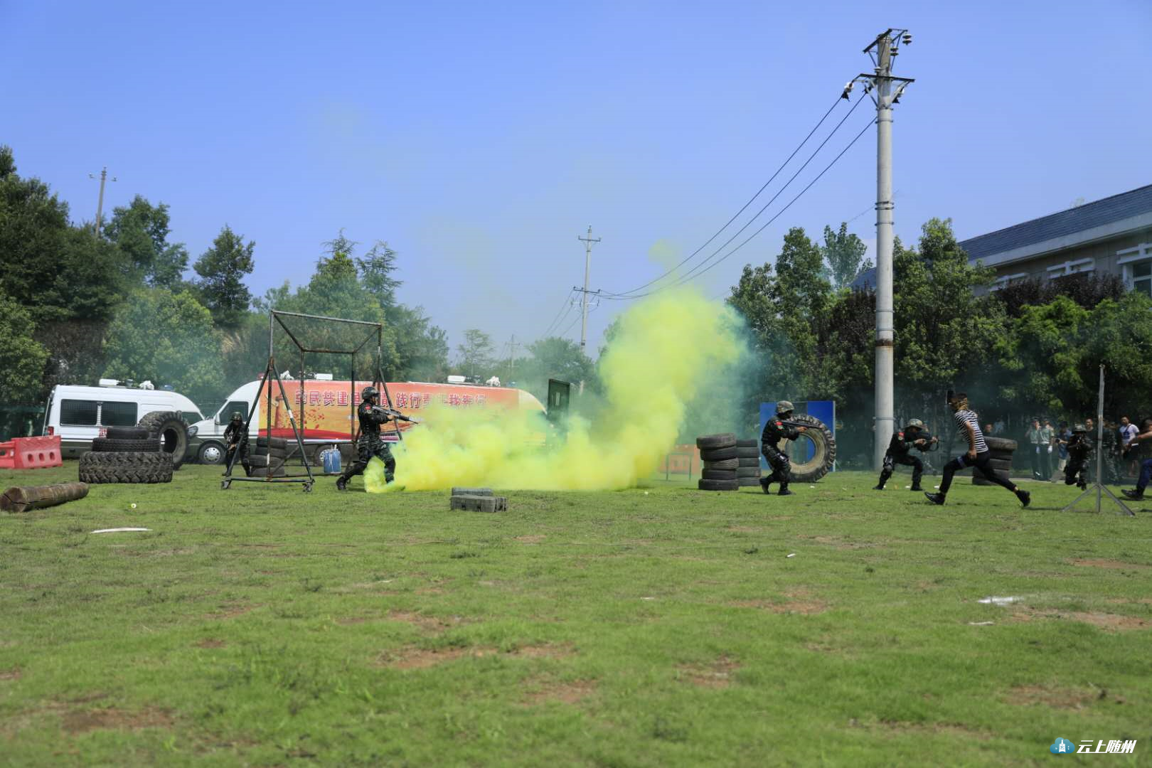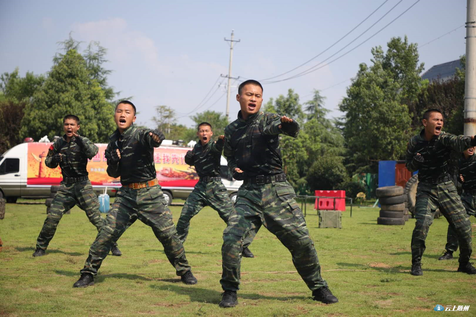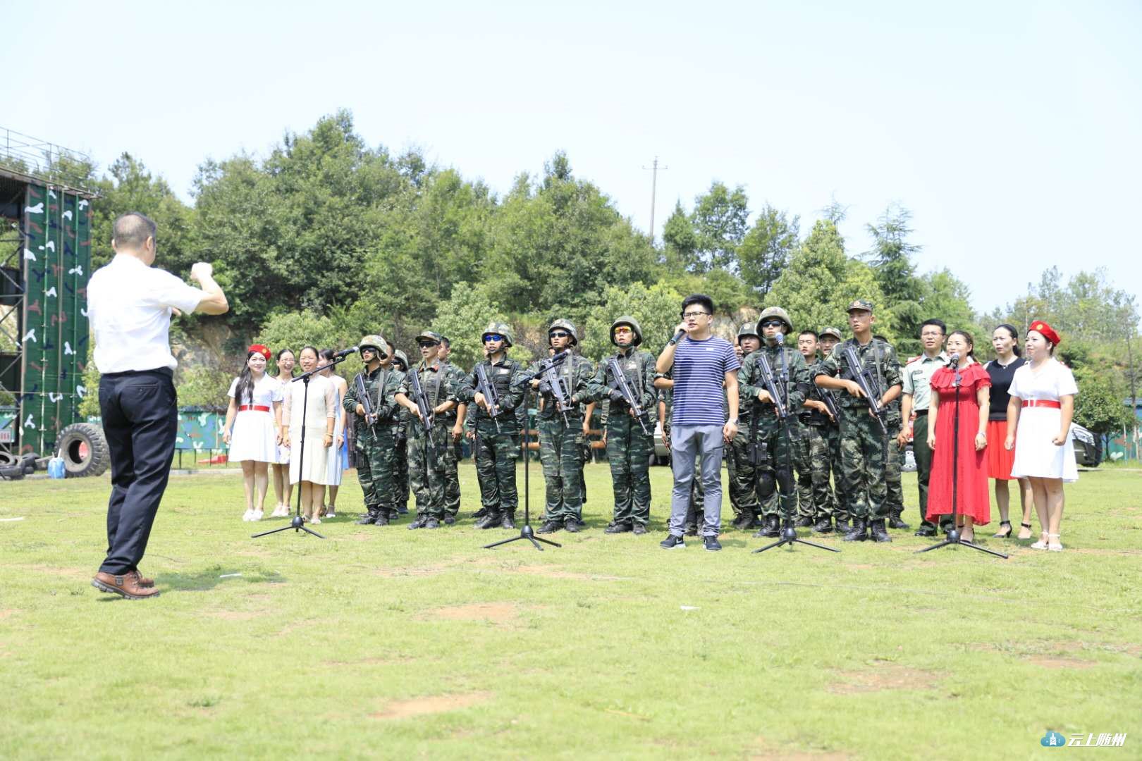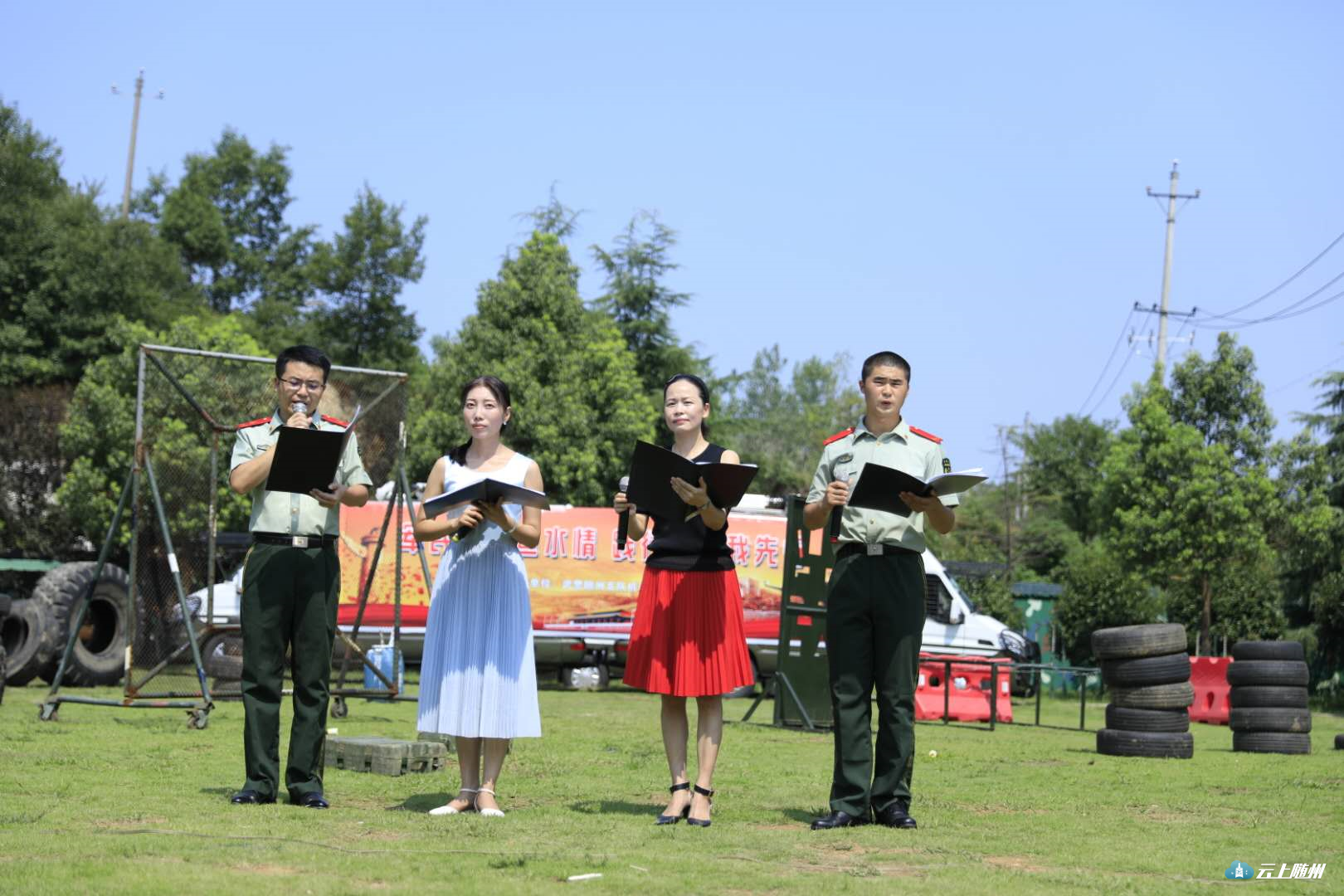 在训练场搭建的临时舞台上,官兵们和驻地企业共同举办了一场小型的“军民联欢会”。在《男儿当自强》的音乐声中,20名官兵用矫健挺拔的身姿、干脆利落的动作展现了他们的风采。随后,综合攀登技能表演更让人感到惊心动魄,一根绳索、一副软梯,短短半分钟,官兵们就攀登到十米高的铁壁上。他们的精彩表现,让台下观众惊叫连连、掌声不断。其间,驻地企业员工也带来了他们各自的节目,向武警战士献歌献舞致敬词,表达对武警战士的情谊。
