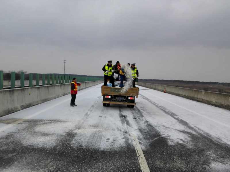广水大队辖区麻竹高速随州至大悟段桥梁积雪结冰,高速警察与路政养护对路面洒盐除雪。