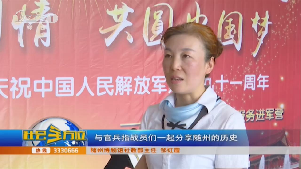 今天是八一建军节,在这样一个光辉的日子里,我们把这份文化大餐送进部队,与官兵指战员们一起分享随州的历史、文化,我们感到无比的光荣,借此机会我们也祝福所有的官兵指战员们节日快乐。