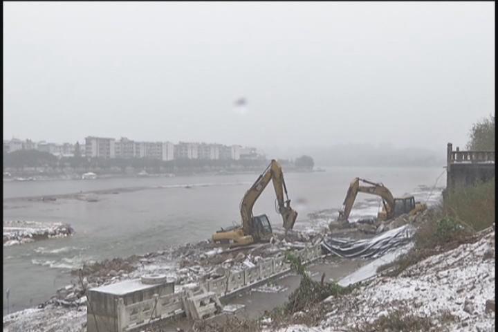 在施工现场,记者看到,雪越下越大,已经将被爆破的氵厥水一桥染上了一层白色。现场的工作人员告诉记者,昨天下午氵厥水一桥被成功爆破之后,他们首先对河道进行了部分清理,防止破碎物将河道堵塞。