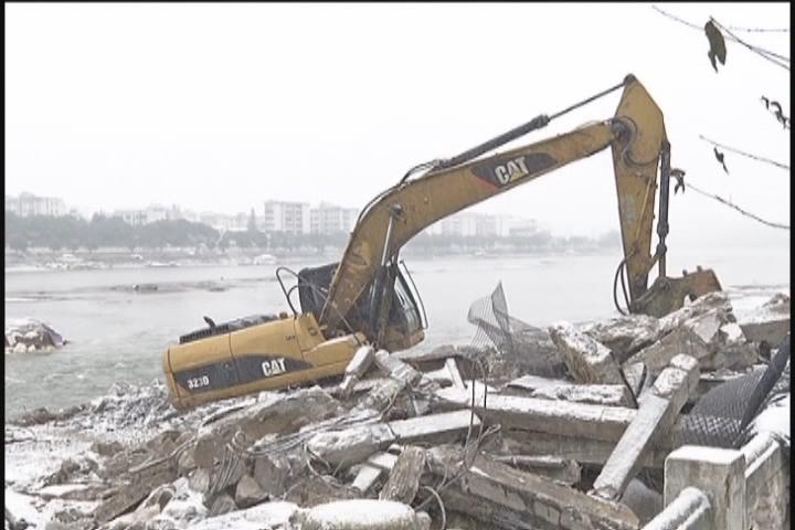 【导语】昨天,氵厥水一桥被成功爆破,今天,尽管下起了雪,但在一桥施工现场,工人们依然在忙碌着拆除后续工作,我们一起去看看。