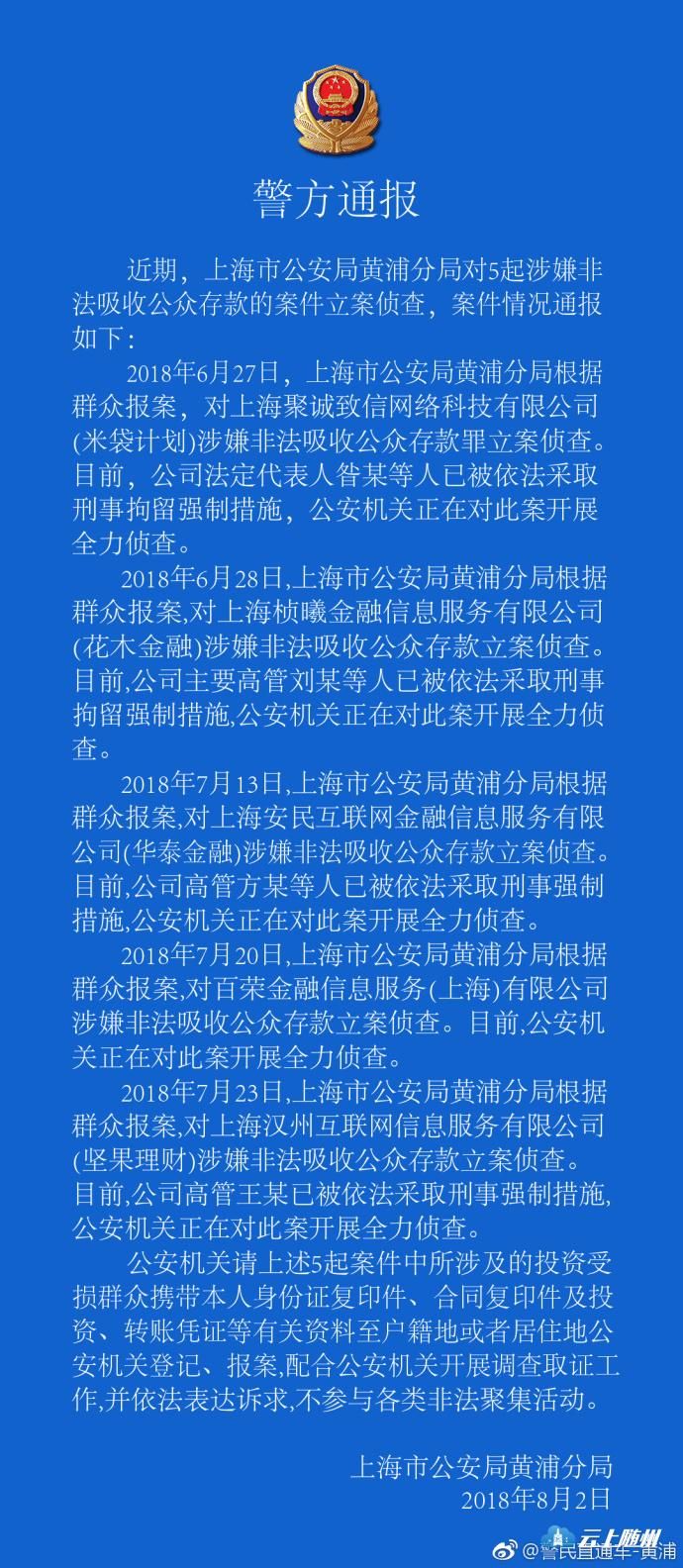 据上海市公安局黄浦分局官方微博消息,上海市公安局黄浦分局8月2日发布警方通报,对5起涉嫌非法吸收公众存款的案件立案侦查,案情通报如下: