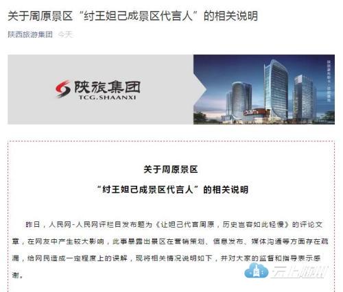 陕旅集团称,纣王、妲己形象的“过度曝光”,使部分媒体和网友产生了误解,误认为周原景区以纣王和妲己“代言”,是在伤害周文化,“对此景区感到十分抱歉”。
