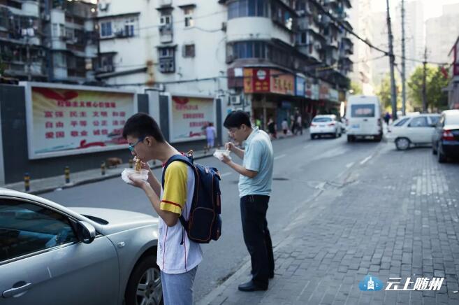 汉口一对父子边吃热干面,边等出租车。
