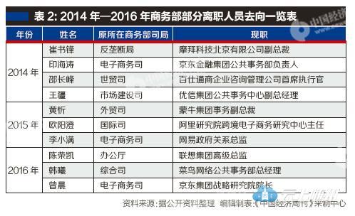 从此前媒体披露出来的商务部部分辞职人员去向来看,大部分商务部的辞职干部都选择了到企业任职,其中不乏在联想、阿里、腾讯等知名企业担任高管的人员。从工作性质上来看,辞职后的职位大致与此前在商务部负责的事项相关。(商务部部分离职人员去向见表2。)