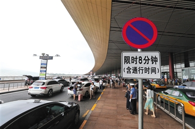 昨日,首都机场T3航站楼,出发层已竖立了“限时8分钟”的指示牌。 记者 王飞 摄