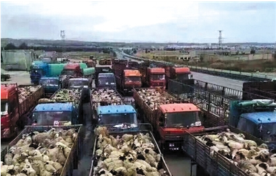 数十辆卡车载着羊群前往放生目的地色达草原。